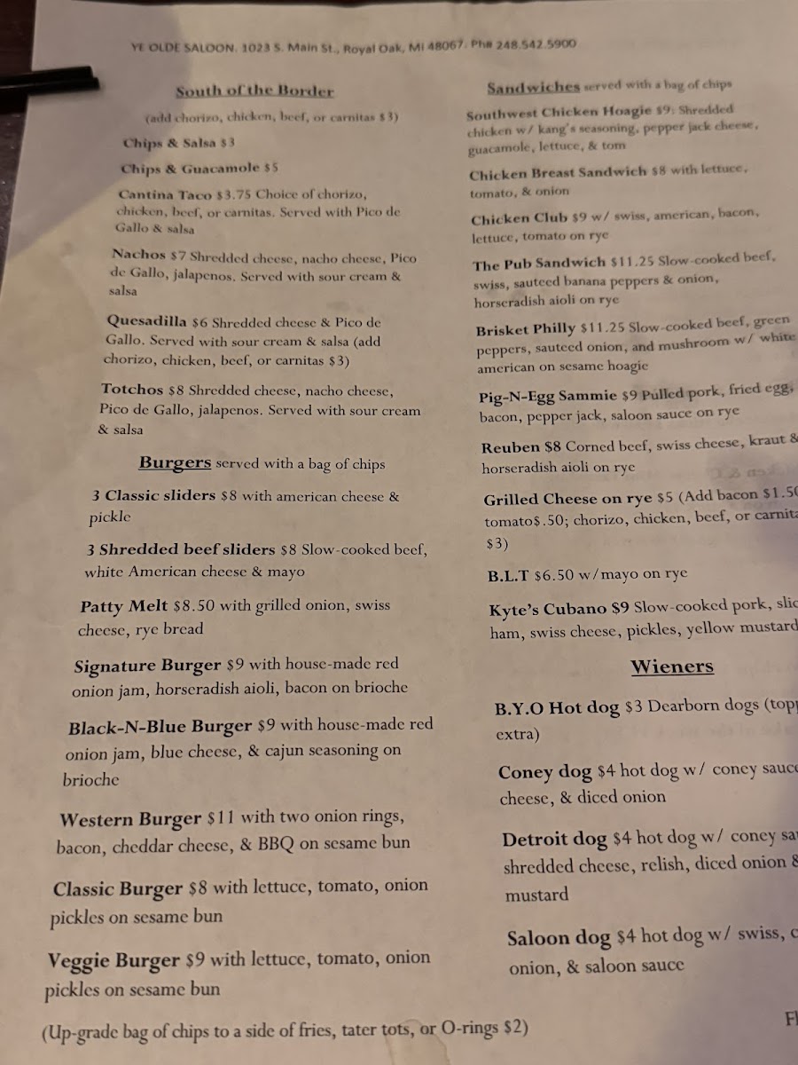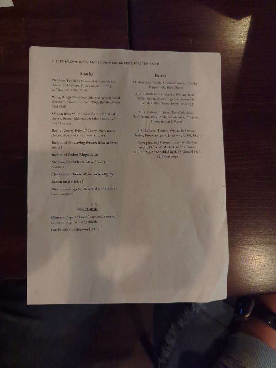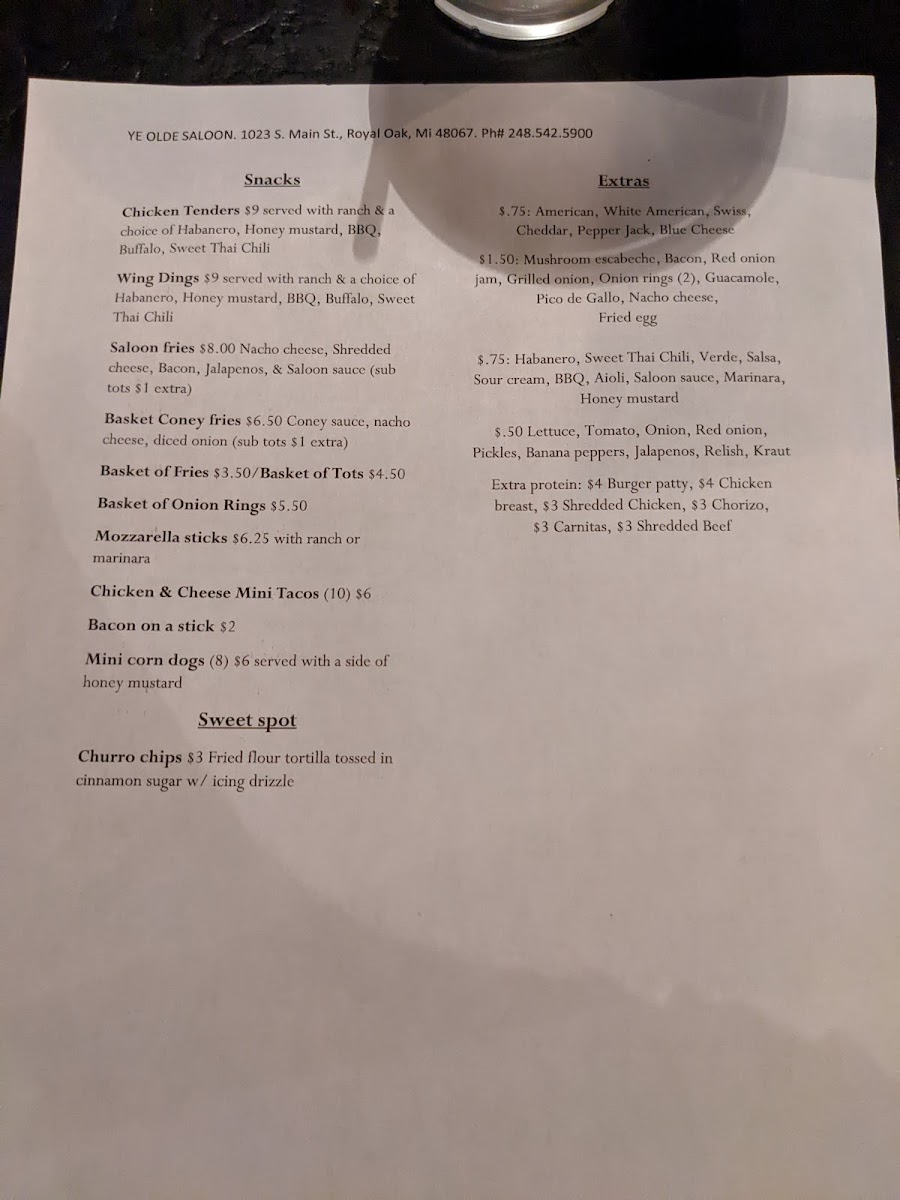Ye Olde Saloon Menu