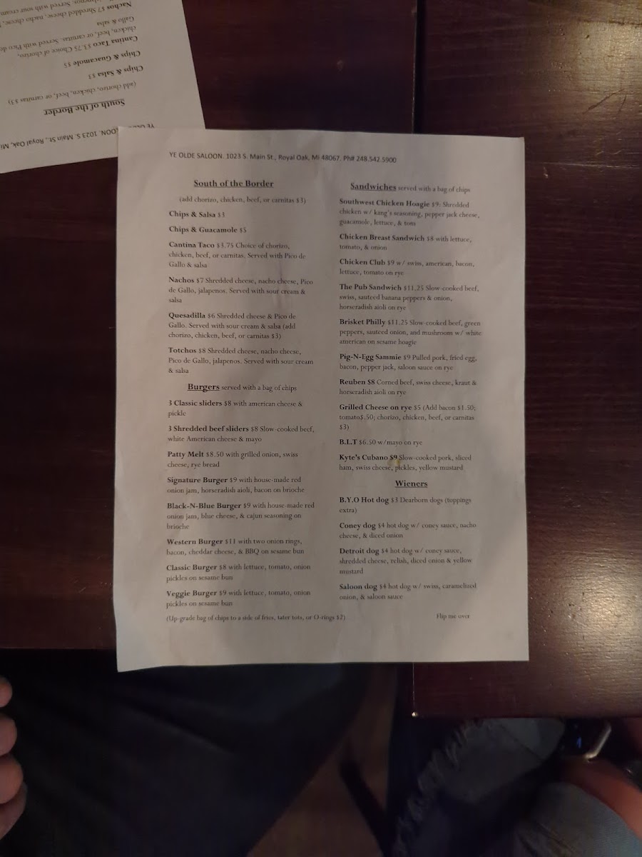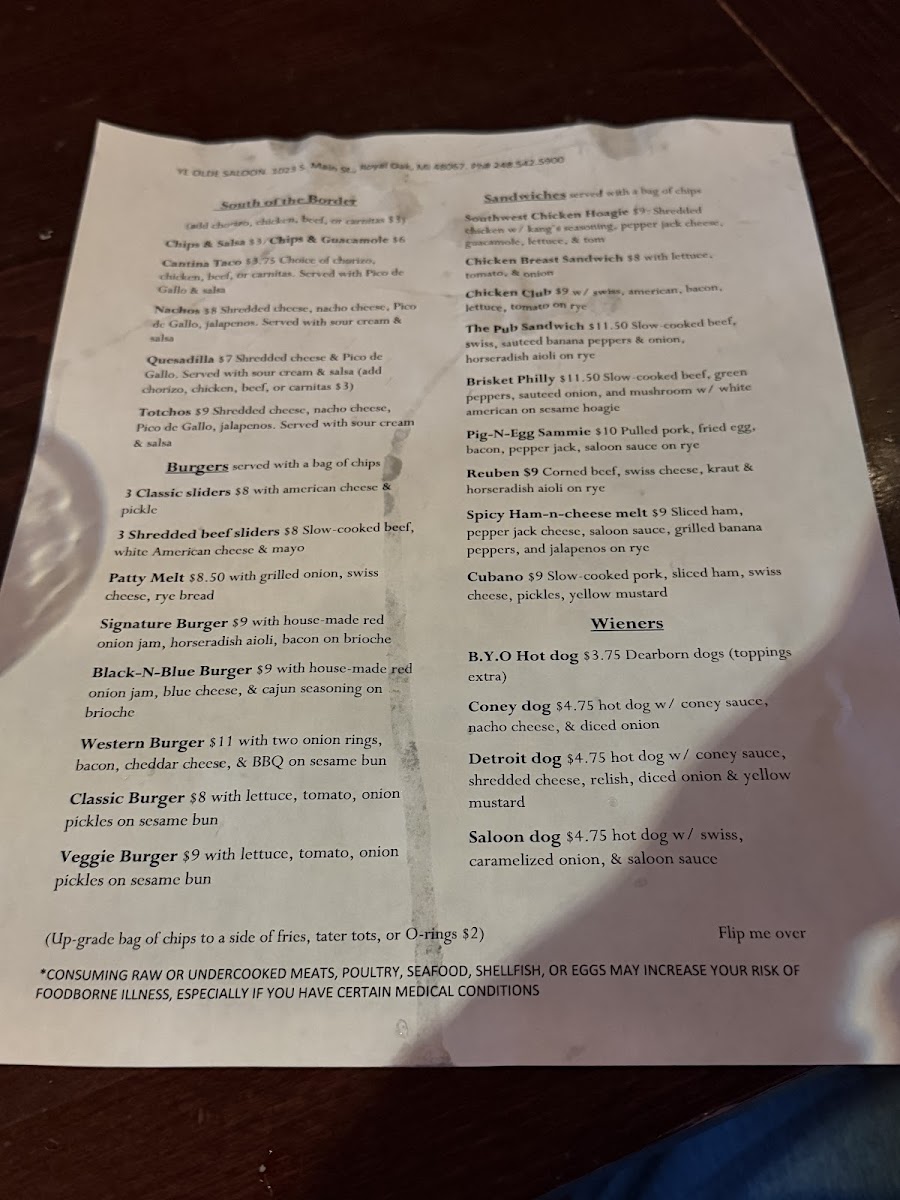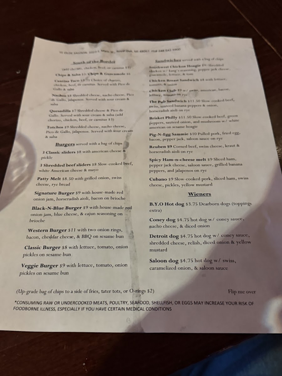 Ye Olde Saloon Menu