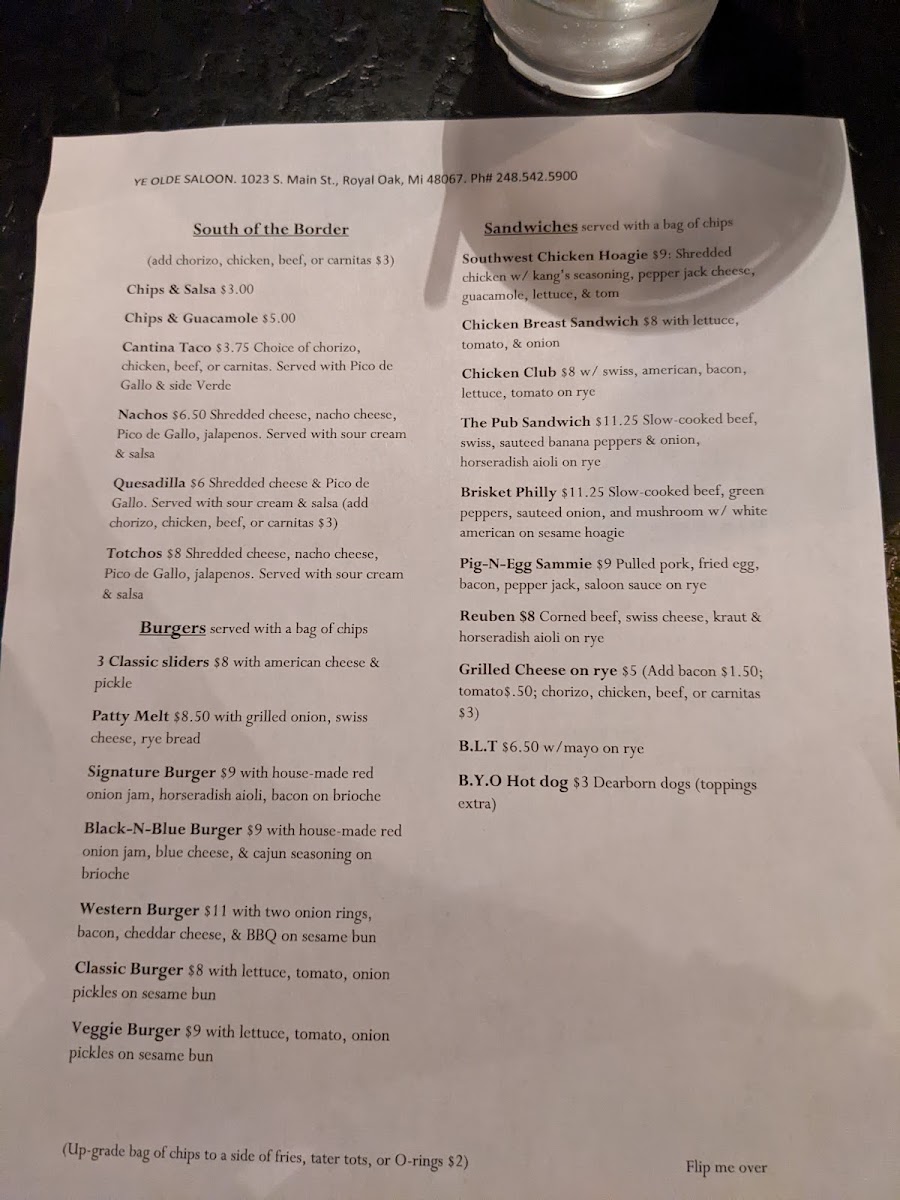 Ye Olde Saloon offers a straightforward, welcoming menu centered around classic bar & grill fare. The selection features casual bites and comforting drinks that perfectly match the friendly, no-frills dive bar atmosphere you'll find inside. Whether you're stopping in for a quick snack or settling in for a laid-back dinner, the menu delivers familiar flavors with a satisfying, homey feel.